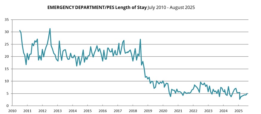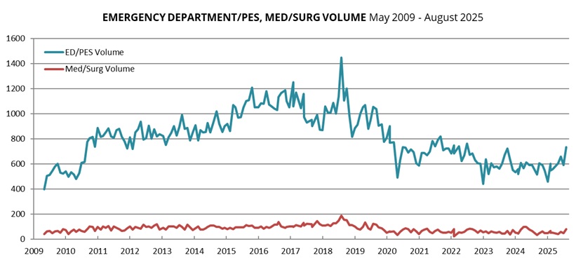 - The number of behavioral health patients seeking psychiatric care in emergency departments has decreased from a monthly average of 1,061 in 2018 to 593 through Q2 of 2025.