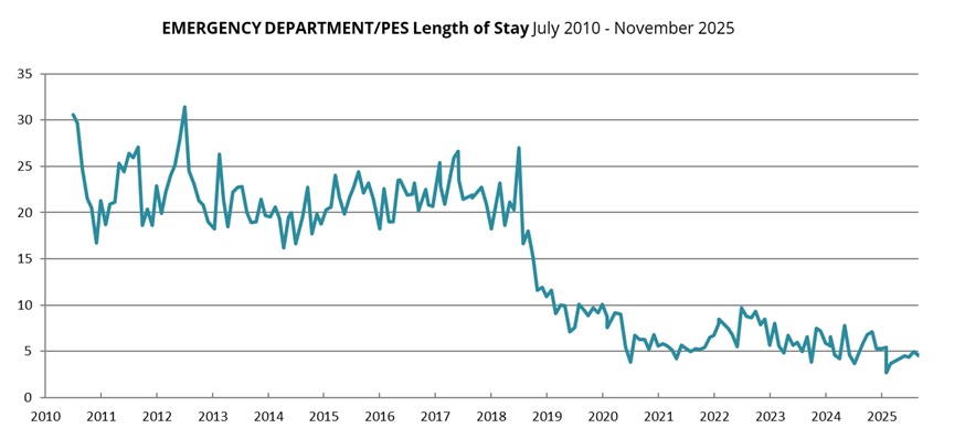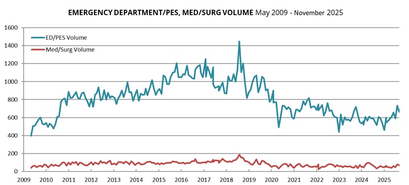 - The number of behavioral health patients seeking psychiatric care in emergency departments has decreased from a monthly average of 1,061 in 2018 to 631 through Q3 of 2025.