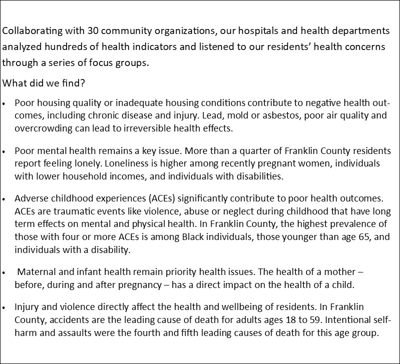 November 2024 – Locally, nearly 14% of Franklin County residents experience food insecurity, with limited access to and availability of nutritionally adequate and safe food.