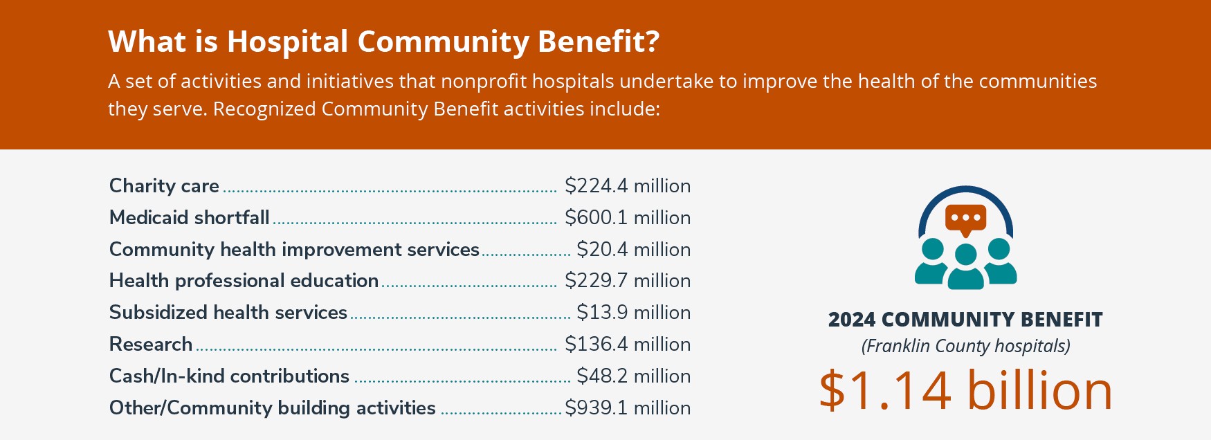 The 2026 Community Impact Report shows that Franklin County’s not-for-profit hospitals provided more than $1.14 billion in total community benefit in 2024. These community benefit activities include: